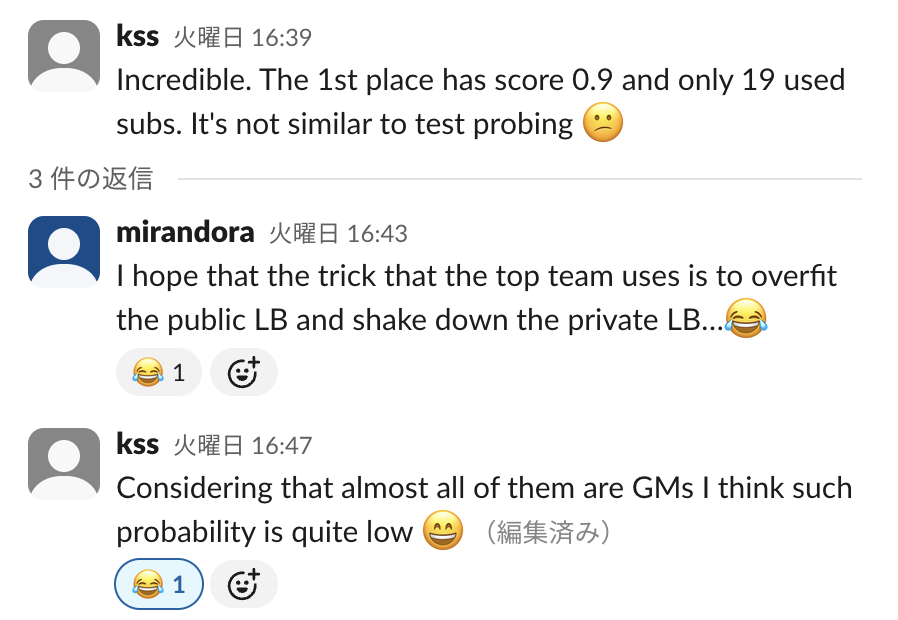 終盤、上位陣が明らかに異常なスコアの上がり方をしたことで、自分たち含めて多くの参加者が何かしらのトリック(あるいはリーク)があることは気付いたものの、肝心のそれが何なのかが最後までわかりませんでした。